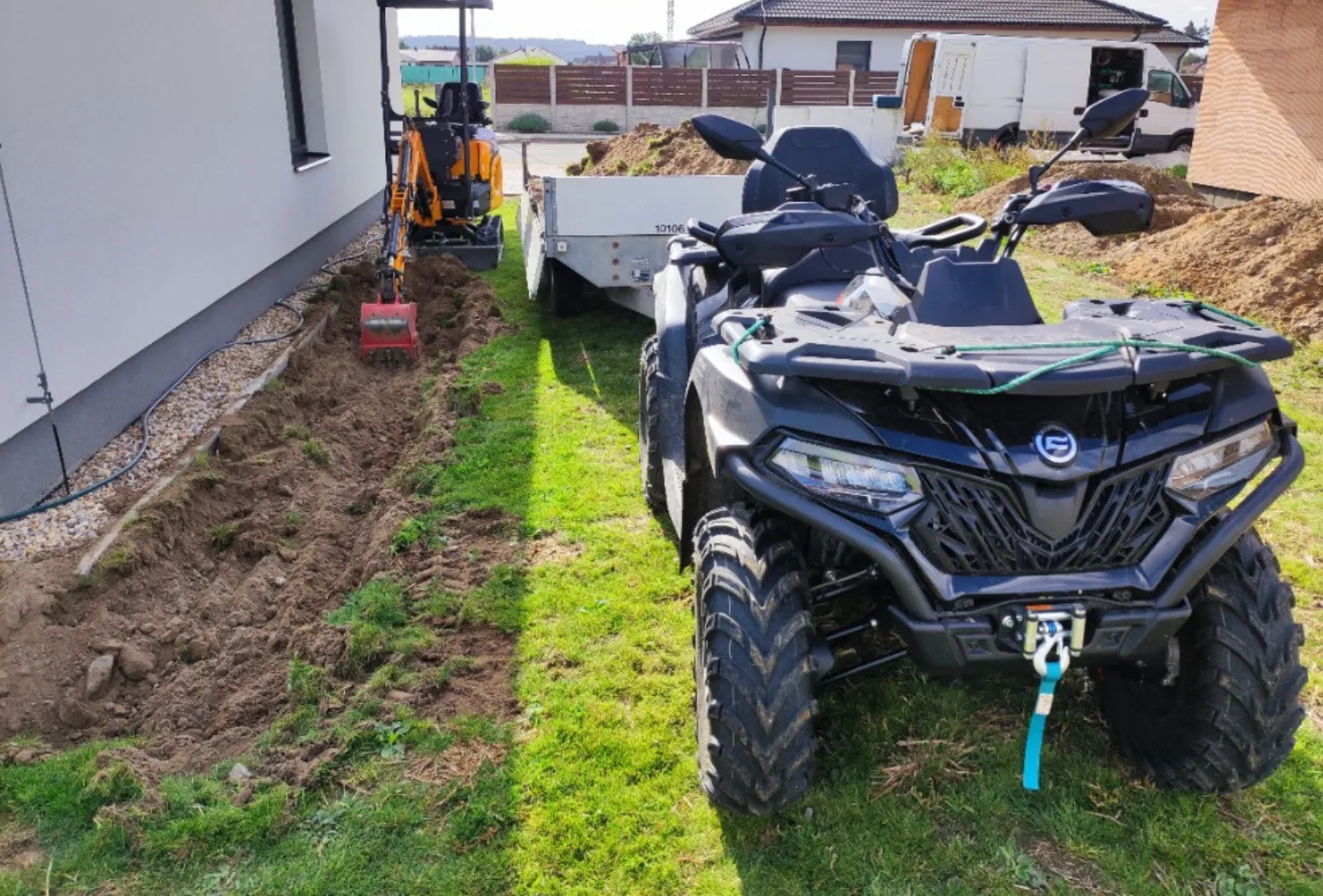 Díky vlastní technice – minirýpadlu, čtyřkolce s vozíkem a dalším vybavením – jsme schopni pracovat i v hůře přístupných místech rodinných domů a zahrad.